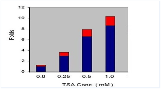 實(shí)例1:分析用不同濃度的TSA處理12小時(shí)的細(xì)胞中的總乙酰化蛋白水平。即先用抗AcK瓊脂糖填料IP,再以ELISA方法用HRP標(biāo)記的抗乙?;贵w做檢測(cè)不同濃度TSA處理的細(xì)胞中,快速檢測(cè)出其蛋白質(zhì)乙?;黾舆_(dá)10倍。
