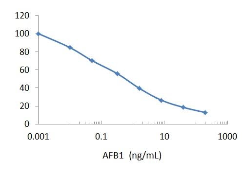 Direct competitive inhibition ELISA using immobilized AFB1-BSA (ICP1203, 0.1 mg/mL) and anti-AFB1 HRP (0.1 μg/mL), 50% inhibition occurred at 0.5 ng/mL of free AFB1 in non-optimized conditions.