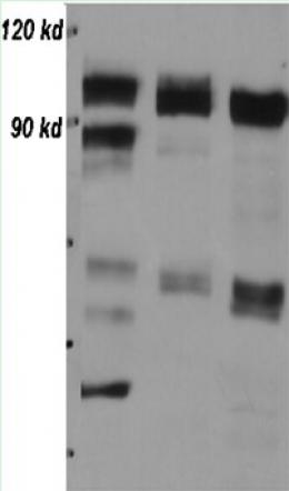 Western blot analysis of HeLa (left), THP1 (middle) and 3T6 cell lysate (30 μg) with CN0817.