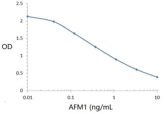 Direct competitive inhibition ELISA using immobilized anti-AFM1 (ICP1798, 0.2 ug/uL) and AFM1-HRP (ICP1788, 0.1 μg/mL), 50% inhibition occurred at 0.5-1 ng/mL of free AFM1 in a non-optimized conditions. |