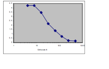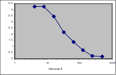 Direct competitive inhibition ELISA using immobilized anti-OA (1.5 μg/mL), and OA-labeled HRP (50 ng/mL). 50% inhibition occurred at 25 ng/mL of free ochratoxin A under non-optimized conditions.