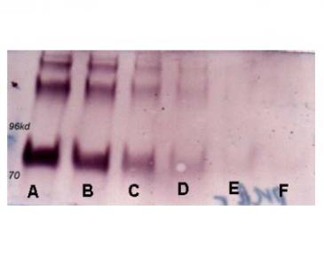 3. Perform the normal gel transfer to nitrocellulose membrane. The membrane needs only to cover between the top of separating gel and the distance to MW marker 60 kd.