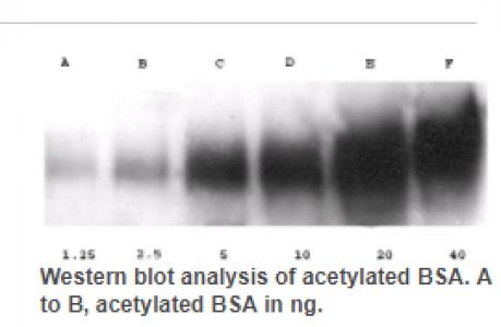 The antibody recognizes proteins acetylated on lysine residues. Tested: acetylated histone, acetylated BSA, and acetylated MBP; there was no reaction to the non-acetylated proteins.