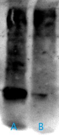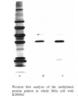 Western blot analysis of the di-methylated proteins from swine spleen cell lysate with (B) and without (A) the presence of methylated BSA, using anti-di-methyl lysine antibody HRP conjugates (anti-MeK HRP, ICP0702)