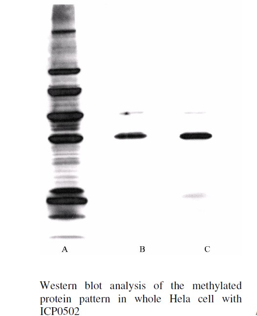 Western blot analysis of the methylated protein pattern in whole HeLa cells with ICP0502.