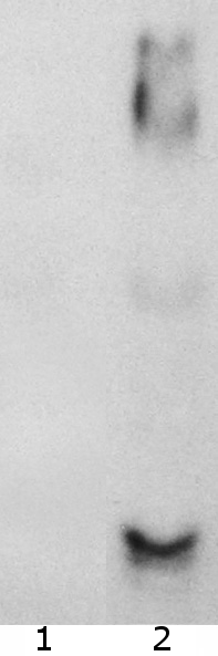 Chicken erythrocytes histones were separated by Triton-Acetic Acid-Urea (1) non-treated and (2) Sodium butyrate (5 mM) treated. Each lane contained 20 ug of total protein. PVDF membrane was probed with mouse monoclonal antibody (ICP0390 was detected with a goat anti-mouse HRPO secondary antibody (1:50000) and developed by chemiluminescence.