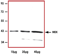 Representative western blot with anti-MEK1/2 (1:1000) using, from left to right, 10 μg, 20 μg and 40 μg of 293 cell lysate.