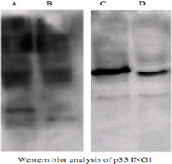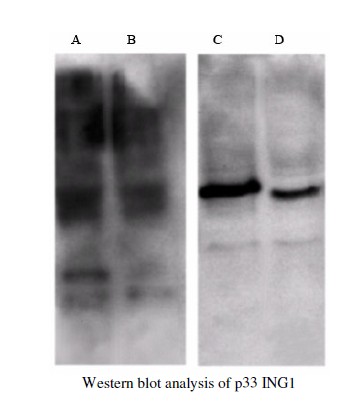A: Cell expressed-flag p33 ING1, blot with Ab from other commercial source. B: Cell expressed p33 ING1, blot with Ab from other commercial source. C: Cell expressed-flag p33 ING1, blot with Ab ICP0280. D: Cell expressed p33 ING1, blot with Ab ICP0280.