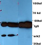 Western blot analysis of mouse brain and spleen samples immunoprecipitated with anti-ERK2 antibody: left two lanes with ERK 2 and right two lanes with pre-immune serum.