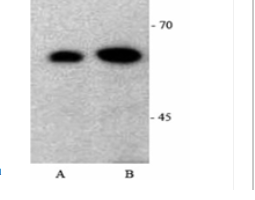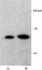 Western blot analysis of p53 in HeLa cell lysates with p53 antibody (ICP7110) A: 15 μg/mL crude protein B: 45 μg/mL crude protein