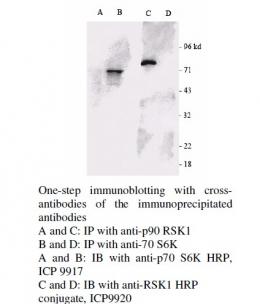 ICP9919 The affinity purified rabbit polyclonal anti-p90 RSK1 is developed with the C-terminal peptide based on human p90 RSK (C-LAQRRVRKLPSTTL) and conjugated to d-biotin via N-acylation. |