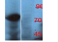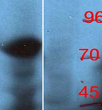 Western blot analysis of the 80 kDa PKC delta HeLa cell lysates (left); the 79kDa signal could be completely inhibited by the presence of 10 μg/mL of the antigen peptide (right).